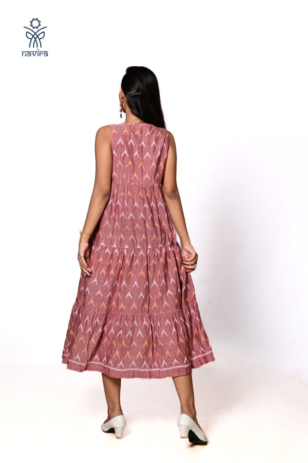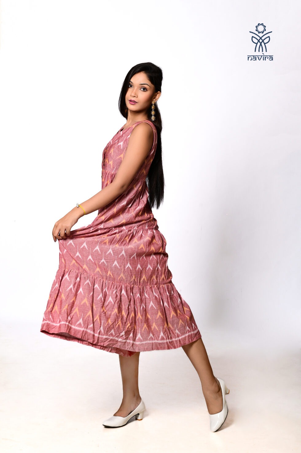 Handloom Odissa Ikat | 100% Cotton | Rose Pink Color Frill Long Dress | 2 Pockets | Sleeveless | Boho Look.
