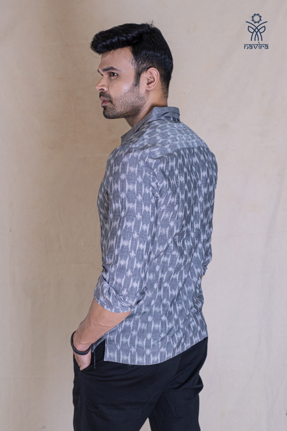 Elevate your formal wardrobe with this Ikat Handloom Shirt, crafted from 100% premium cotton and woven for over 5 days by Artisan Aparna from Maniabhandha in Odisha. The subtle yet striking Ikat patterns add a refined touch of tradition, making it perfect for workdays, meetings, or formal gatherings. With a crisp finish and tailored fit, it balances heritage with modern sophistication.