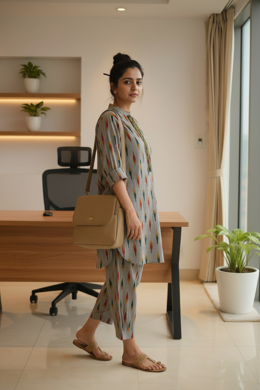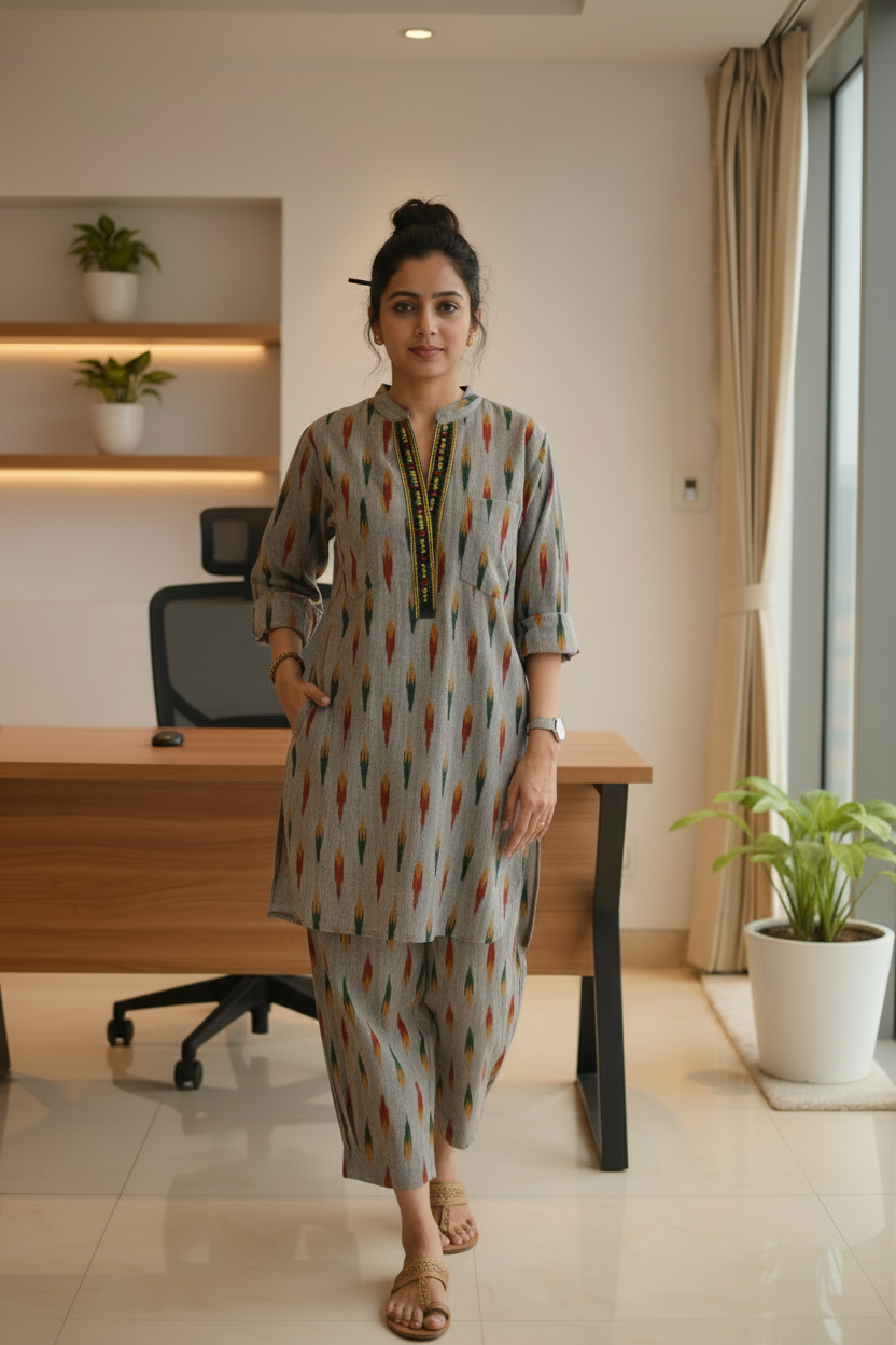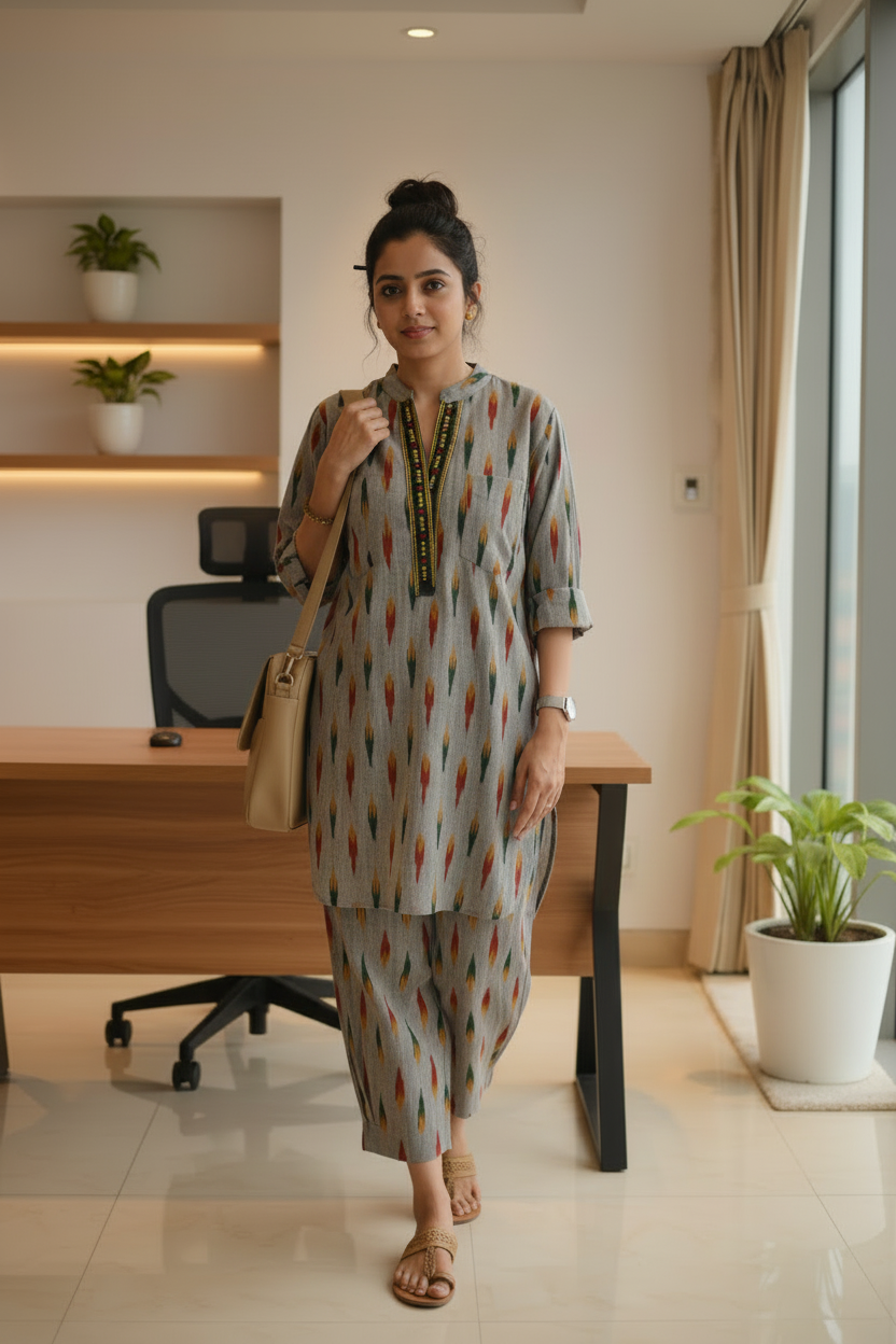 Tailored with care and woven with heritage, Pochampali Handloom Cord set is been sourced from Andra Pradesh. Brings handloom to the wardrobe. Handwoven over 15 days by Artisan Murti from Andra. This is 100% cotton Handloom Pochampali Fabric. Designed for comfort, style. Wear it to any get together out office wear.