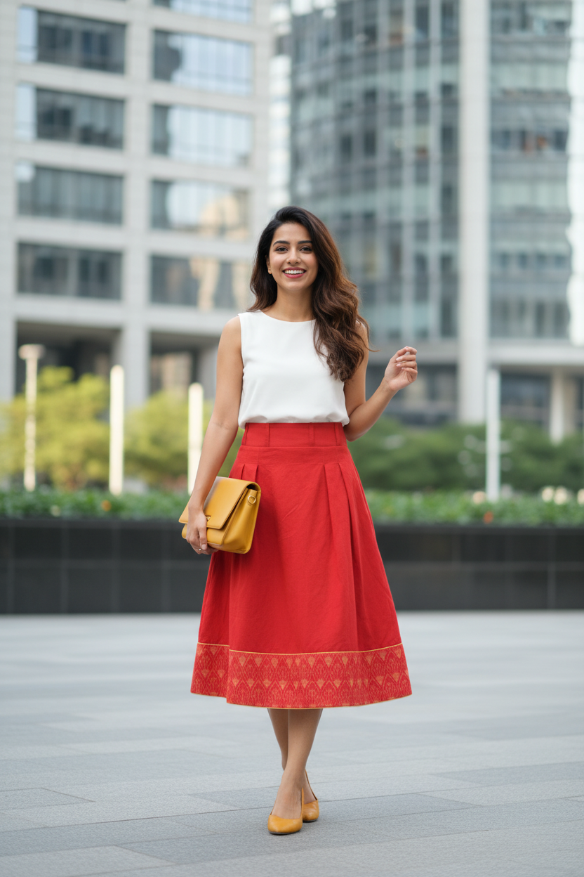 Wear this Skirt with White top. and style this with Flats or Heels.