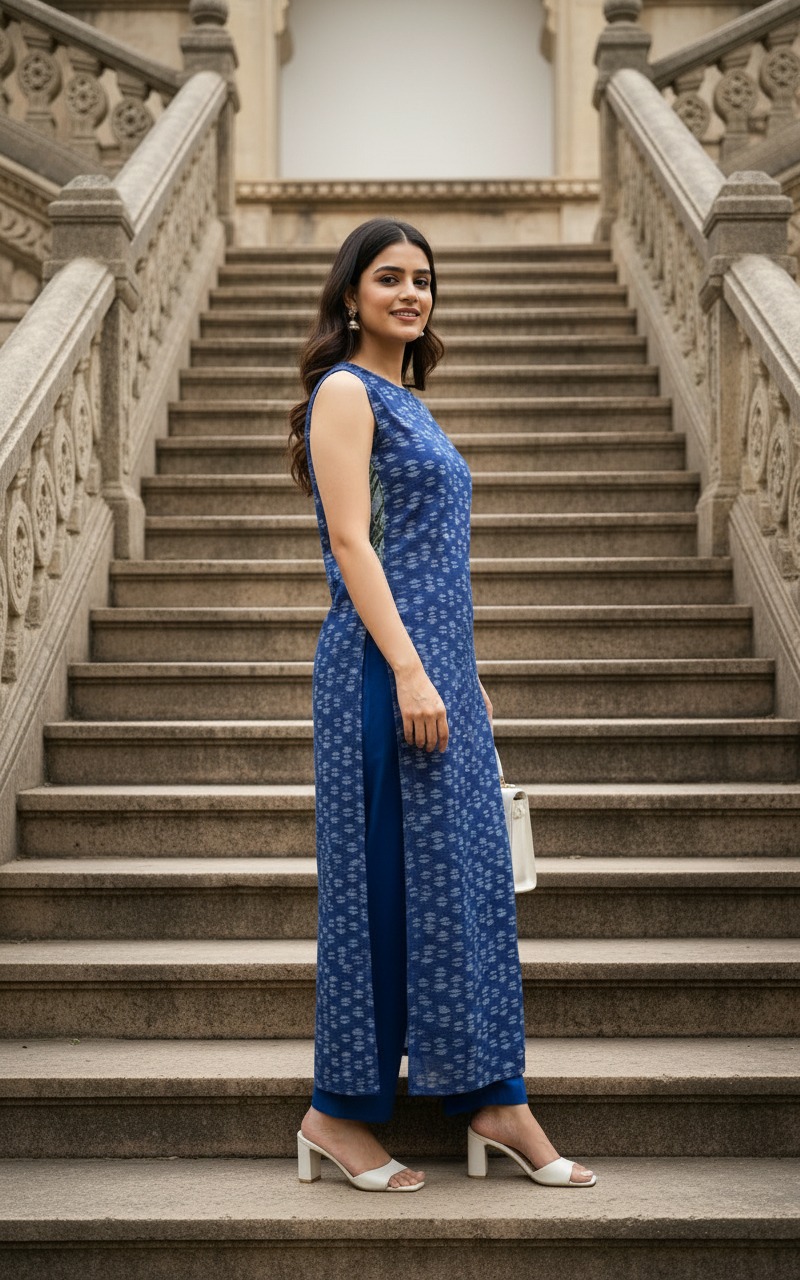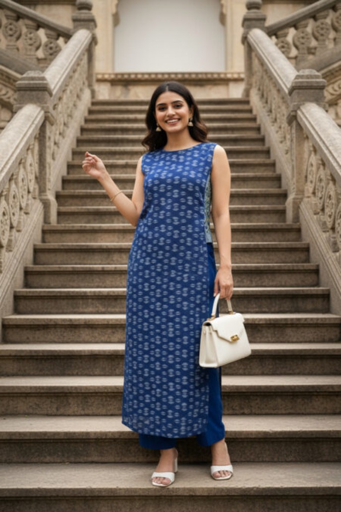 Modern edge meets traditional elegance in the Sharp Suits kurta top and pant. Handwoven over 7 days by Artisan Puspa in Maniabandha, Odisha, this piece is crafted from 100% pure cotton and features the timeless beauty of Odisha Ikat in a clean, sleeveless silhouette, the design is elevated with delicate side embroidery and functional pockets, making it a standout choice for refined office wear.