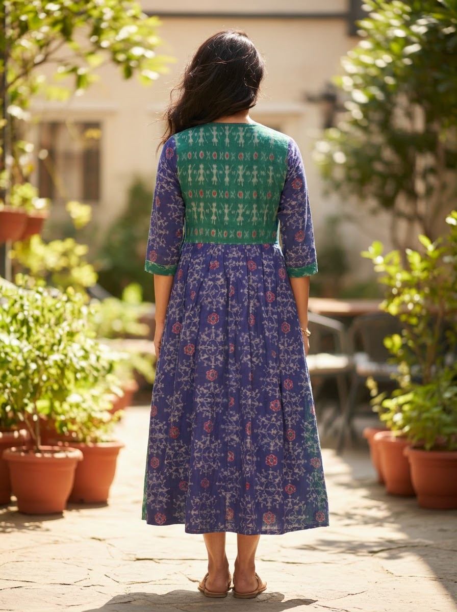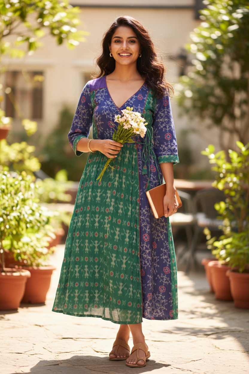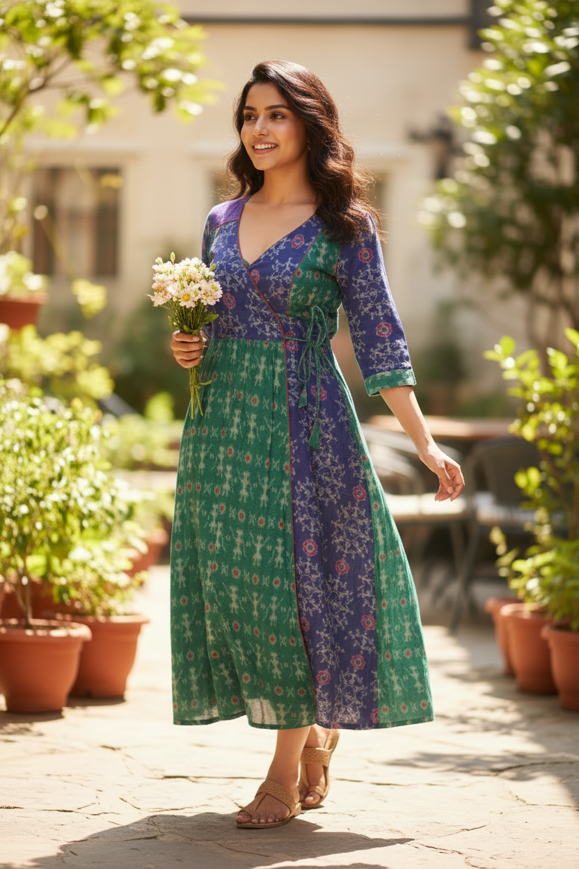 Modern edge meets traditional elegance in the Bright colour Overlapp Dress, Handwoven over 15 days by Artisan Parvati in Barapali, Odisha, this piece is crafted from 100% pure cotton and features the timeless beauty of Odisha Ikat with bright color beautiful traditional motifs, the design is elevated with overlapped dress with tie strings at the waist making it a standout choice for refined get together and travel wearing.