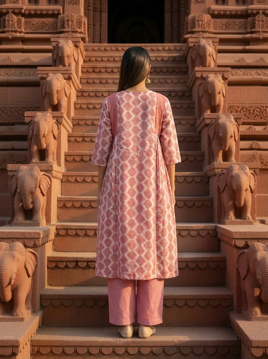 Modern edge meets traditional elegance in the Peach colour Kurta, Handwoven over 15 days by Artisan Akula from Maniabandha, Odisha, this piece is crafted from 100% pure cotton and features the timeless beauty of Odisha Ikat with peach color beautiful traditional motifs, the design is elevated with side gathering and front pin tuck style patch for refined get together and office wear.